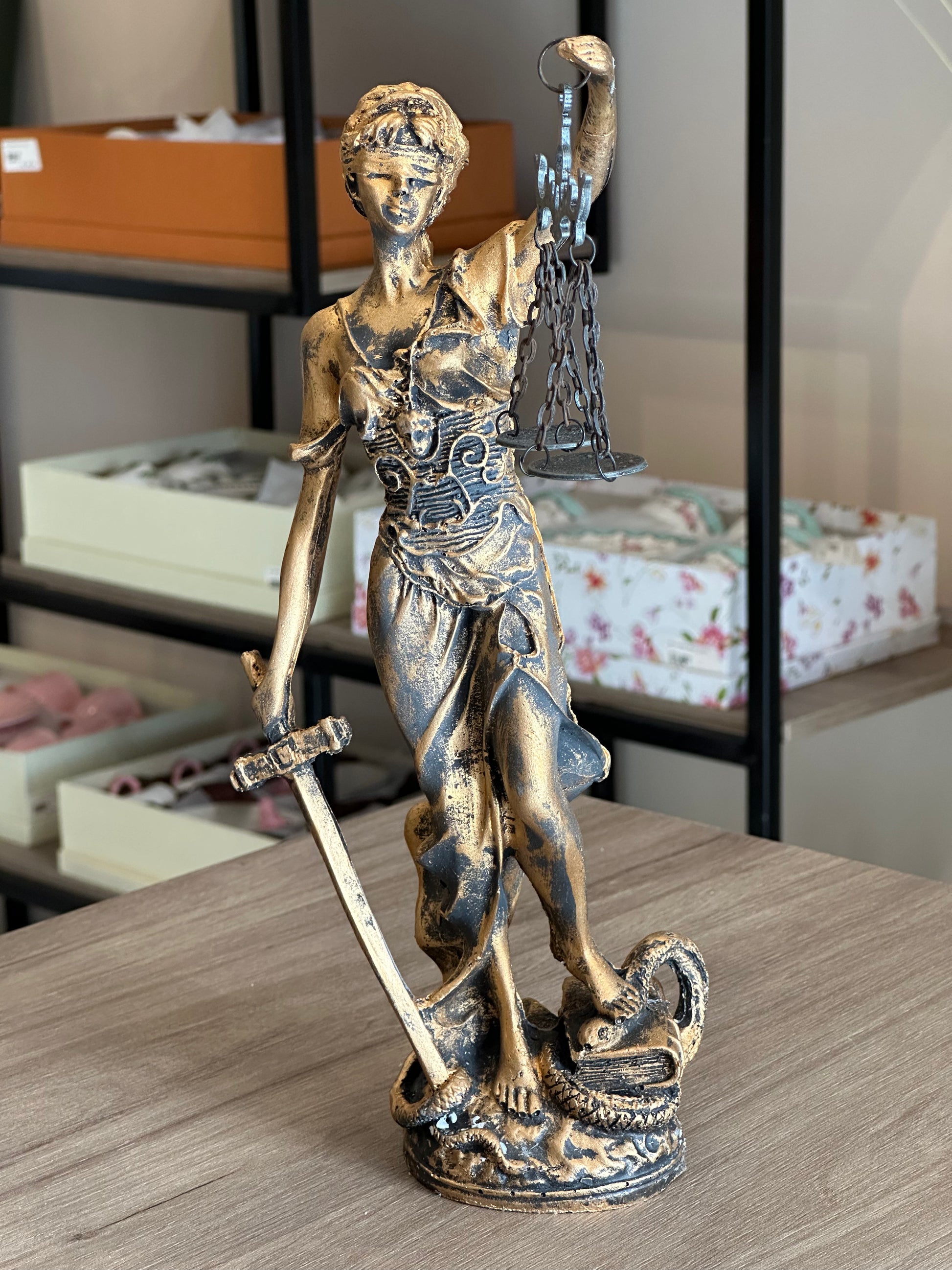 A escultura da Deusa Têmis não é apenas uma peça decorativa — é um símbolo atemporal da Justiça, da ordem e da integridade. Inspirada na mitologia grega, Têmis personifica a lei natural e a imparcialidade, trazendo consigo a balança da equidade e a espada da verdade. Seus olhos vendados revelam o princípio fundamental: a justiça deve ser cega, livre de preconceitos e interesses.