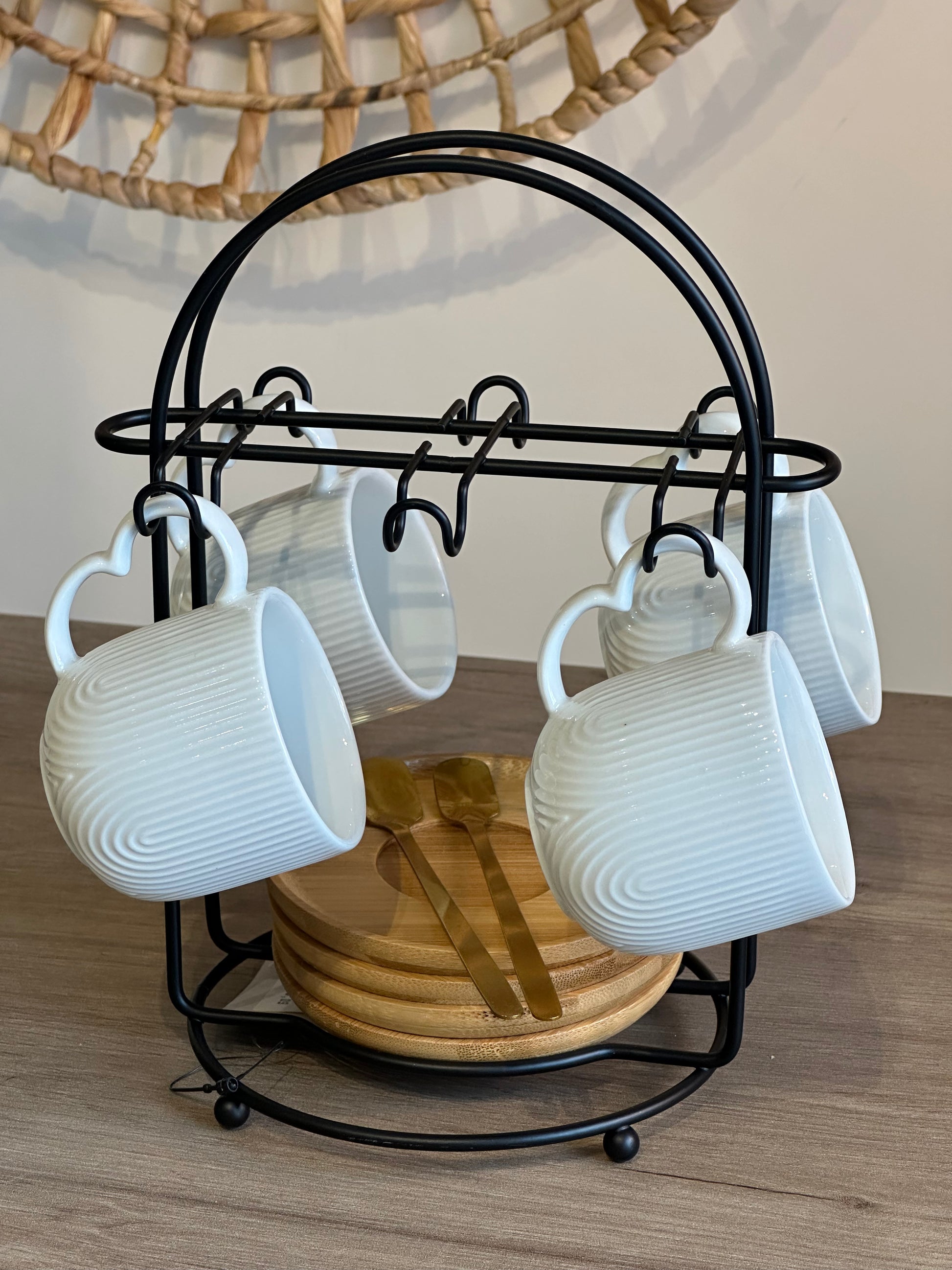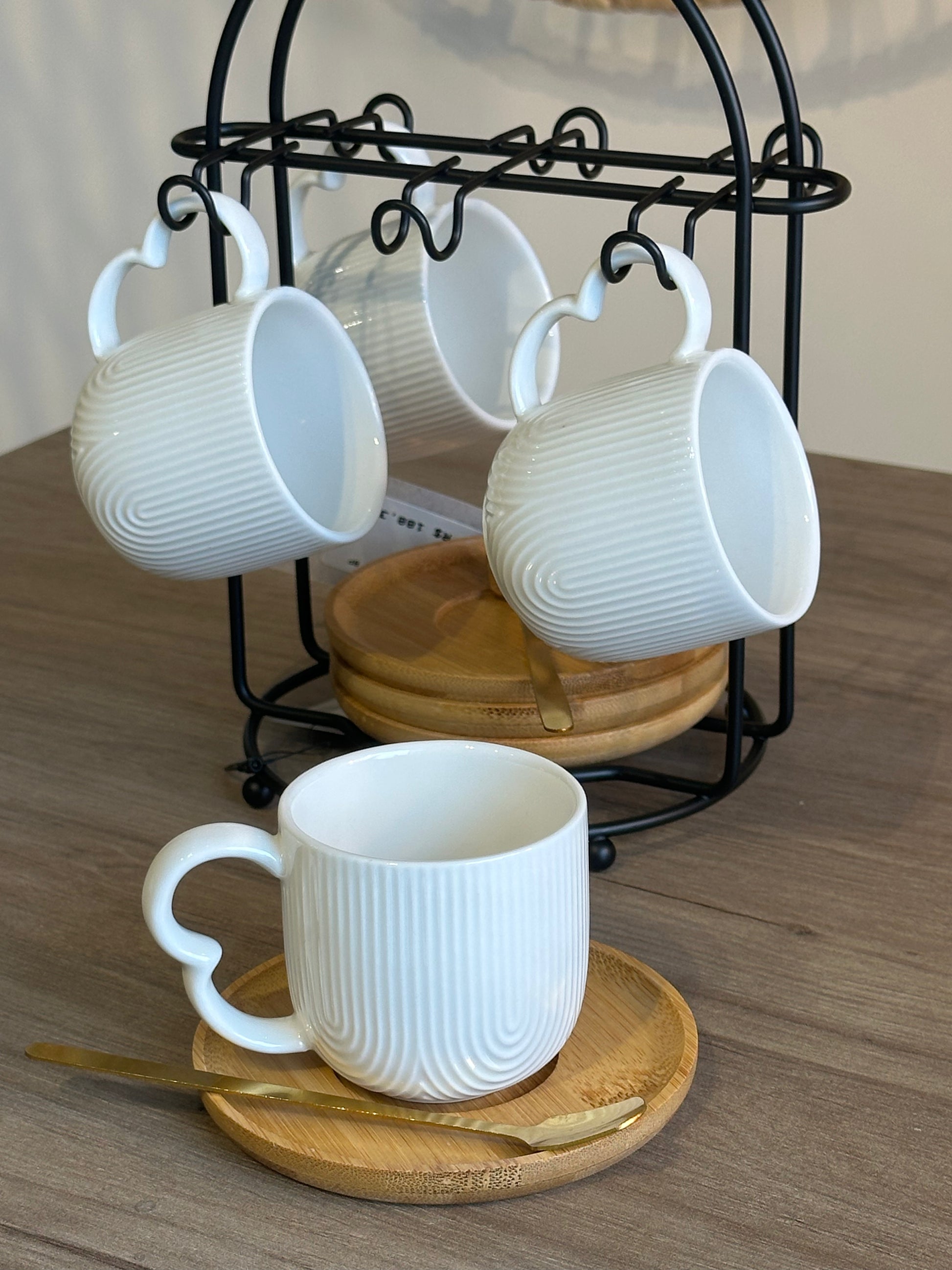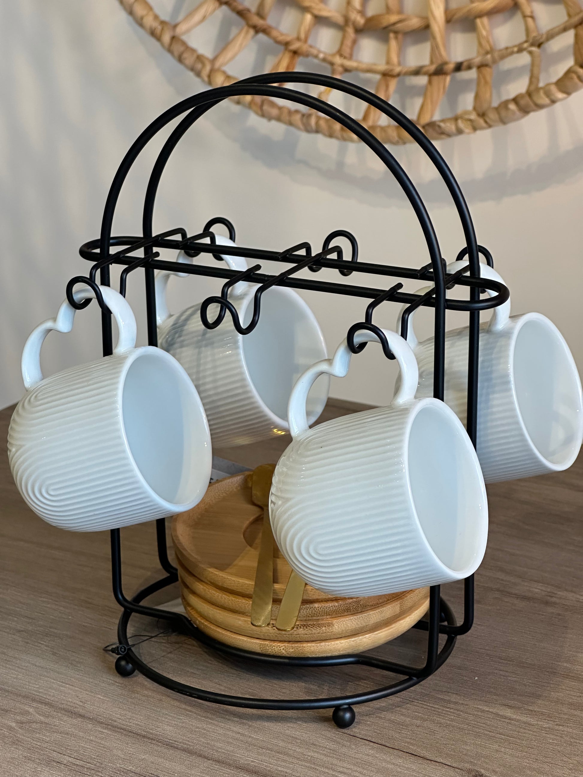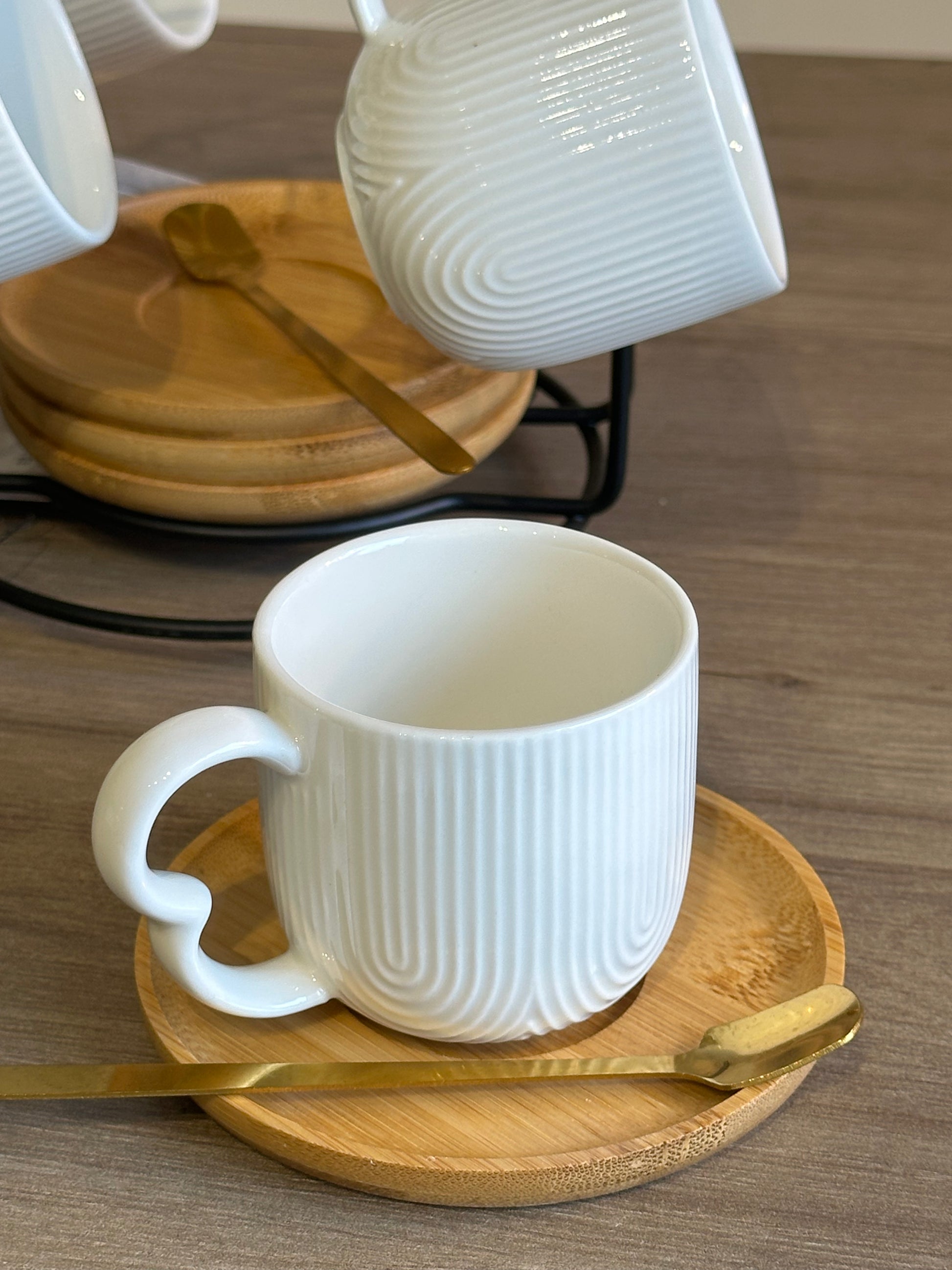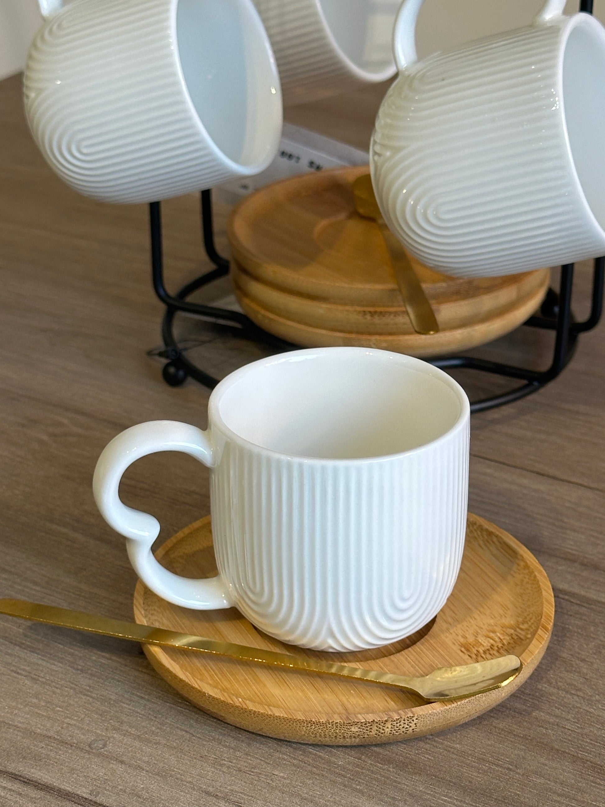 Para completar, o conjunto acompanha 4 porta-copos de madeira, combinando o clássico e o natural em perfeita harmonia. Ideal para quem valoriza detalhes sutis e quer compor uma mesa posta com estilo atemporal, seja no café da manhã, na pausa da tarde ou ao receber visitas especiais.