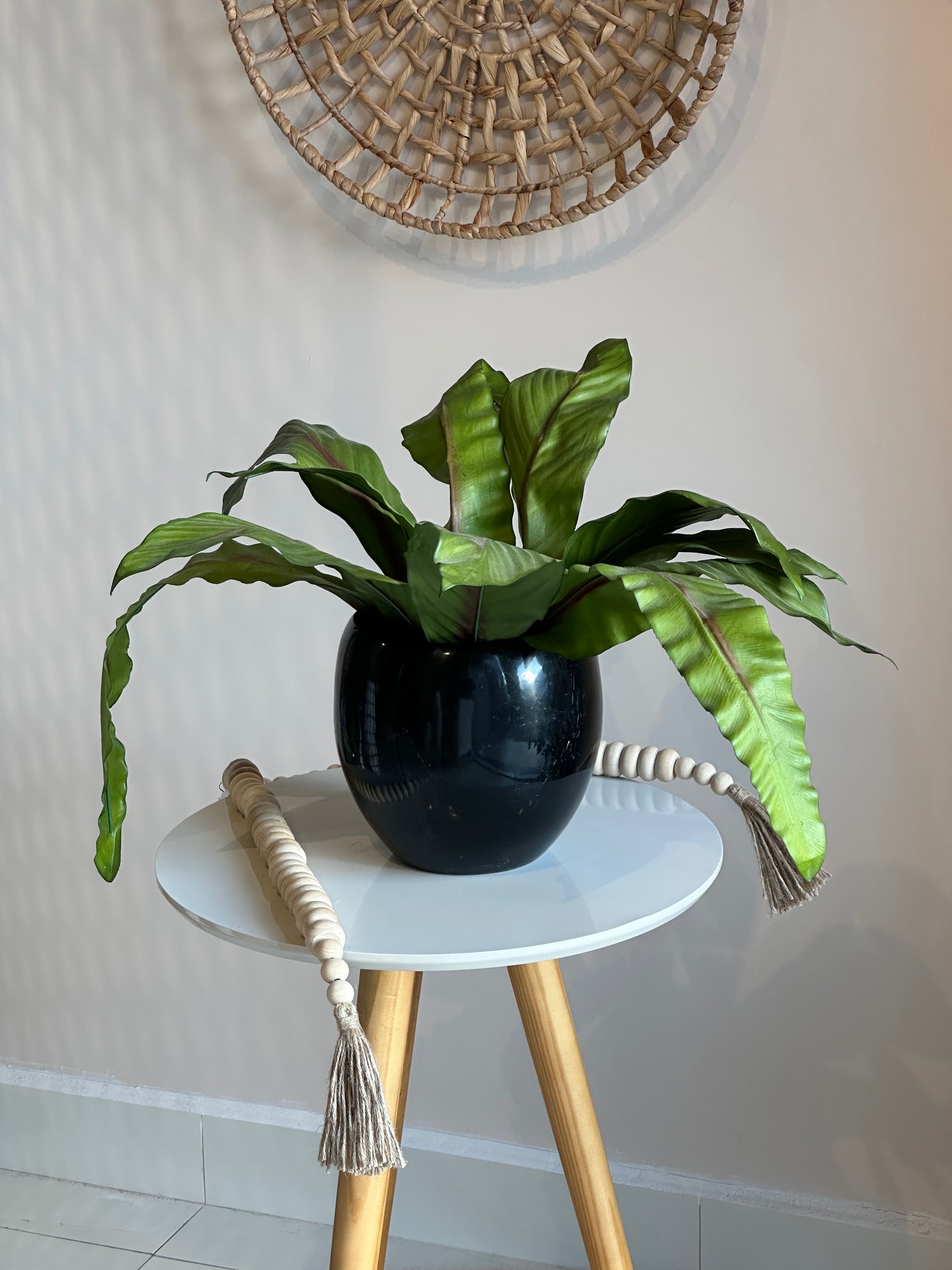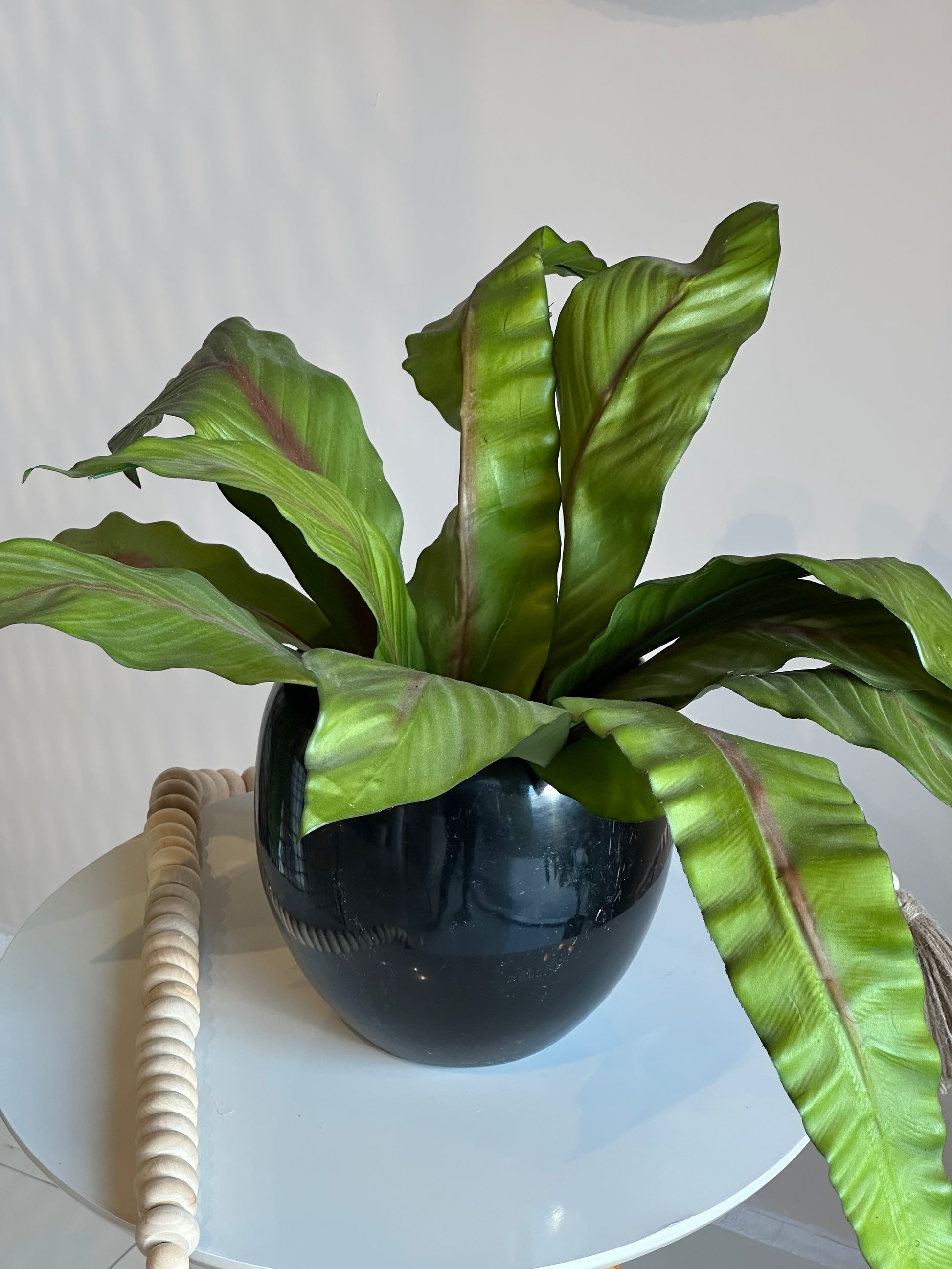 O vaso arredondado, com acabamento em preto espelhado, traz um contraste elegante com o verde vibrante da folhagem, criando um arranjo marcante e versátil, perfeito para salas de estar, halls, lavabos ou escritórios.